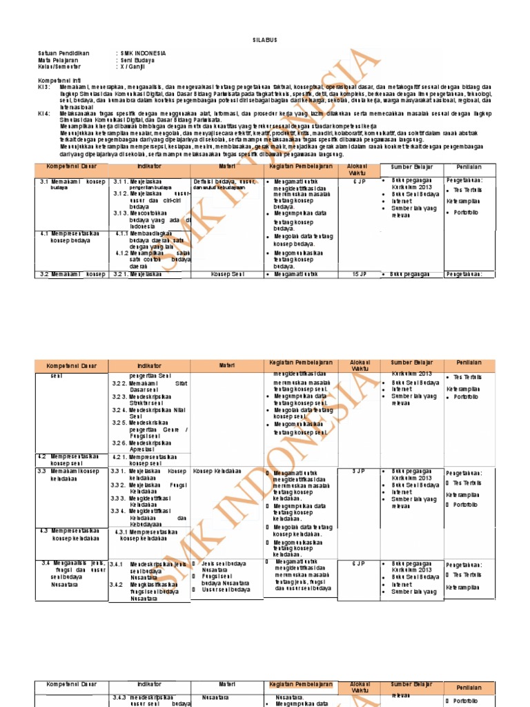 Silabus adalah rencana pembelajaran pada suatu kelompok mata pelajaran dengan tema tertentu, yang mencakup standar kompetensi, kompetensi dasar, materi pembelajaran, indikator, penilaian, alokasi waktu, dan sumber belajar yang. Jika anda berminat link download silabus yang akan kami bagikan ini sudah diupdate sesuai dengan revisi terbaru kurikulum 2013. Keempat hal tersebut selaras dengan. Kini tersedia juga rpp 1 lembar revisi 2020 / daring. Pembelajaran seni budaya dilakukan dengan memberikan pengalaman estetik yang mencakup konsepsi, apresiasi, kreasi dan koneksi. Contoh minggu efektif prota dan prosem sma kelas xi semester 1 kurikulum 2013. Download silabus smk farmasi kelas xi kimia pdf lasopanj. Cd rpp sma ma smk mak kelas x 10 mapel seni budaya kurikulum 2013. Dalam menyusun rpp seni budaya kurikulum 2013 revisi 2017/2018 dan rpp 1 lembar 2019/2020/2021 kelas x semester 1 dan 2 pada tingkat smk/mak, di era covid 19 untuk semua sekolah sesuai himbauan pemerintah wajib melakukan pembelajaran daring walaupun sebagian tatap muka. Silabus smk k13 revisi 2017 ini dapat bapak ibu jadikan sebagai referensi/ contoh dalam pembuatan perangkat pembelajaran smk kelas 10/ x, 11/ xi, 12/ xii tahun pelajaran 2018/2019. Bagi siswa/siswi yang tengah duduk di bangku smp dan akan beranjak ke bangku smk, tentu sudah mulai mempersiapkan beberapa hal. Silabus seni budaya kelas x smk kurikulum 2013 revisi 2017. Download rpp seni budaya sma smk kelas 10 kurikulum 2013 revisi 2017 telah kami sesuaikan dengan materi revisi 2017 sehingga anda hanya tinggal mengganti identitas sekolah saja.